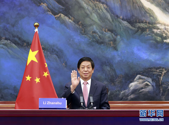 6月2日,全国人大常委会委员长栗战书在北京人民大会堂以视频方式同所罗门群岛国民议会议长奥蒂举行会谈。新华社记者 丁林 摄